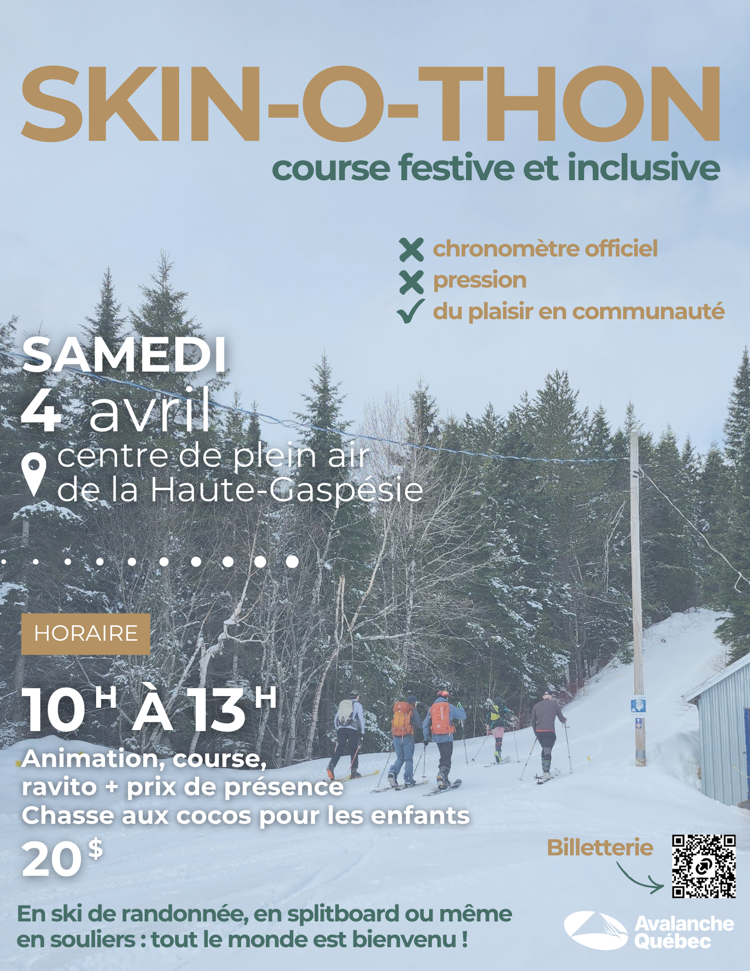 Avalanche Québec est fier d’annoncer l’événement printanier Skin-o-Thon, qui se tiendra le samedi 4 avril au centre de plein air de la Haute-Gaspésie, à Ste-Anne-des-Monts. Ce rassemblement est ouvert à tous·tes et vise à célébrer l’arrivée du printemps ainsi qu’à souligner la belle saison hivernale 2025-2026, le tout en profitant d’une journée à la station de ski sous forme de course conviviale en peaux de phoque (ski de randonnée).